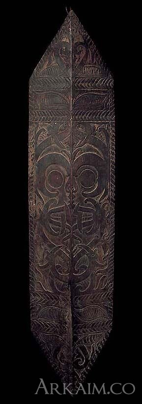 Щит даяков с Борнео. Старые боевые щиты были большого размера. Украшались они иногда снаружи человеческими волосами, срезанными с отрубленных голов. По размеру они отличались у морских и горных даяков
