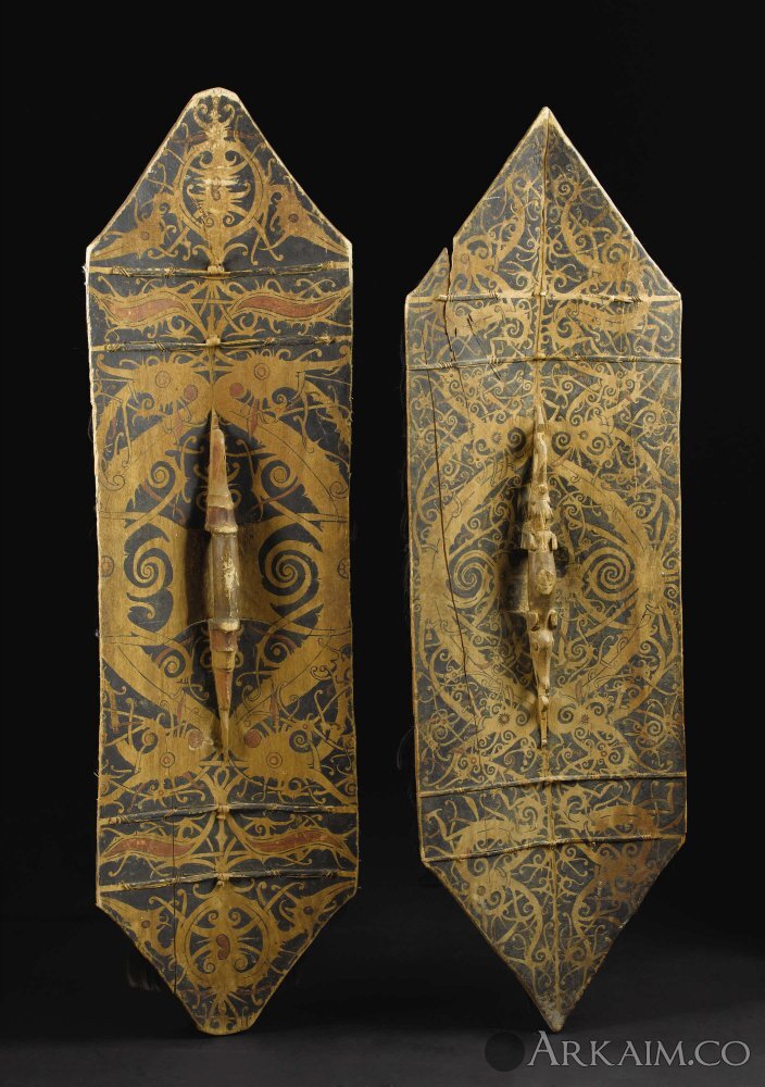 Щит даяков с Борнео. Старые боевые щиты были большого размера. Украшались они иногда снаружи человеческими волосами, срезанными с отрубленных голов. По размеру они отличались у морских и горных даяков