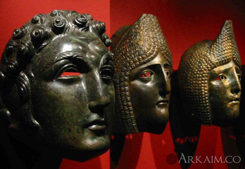 Маска с лицом Александра Македонского (слева) и женские маски II—III вв. н.э. Музей в Штраубинге, Германия