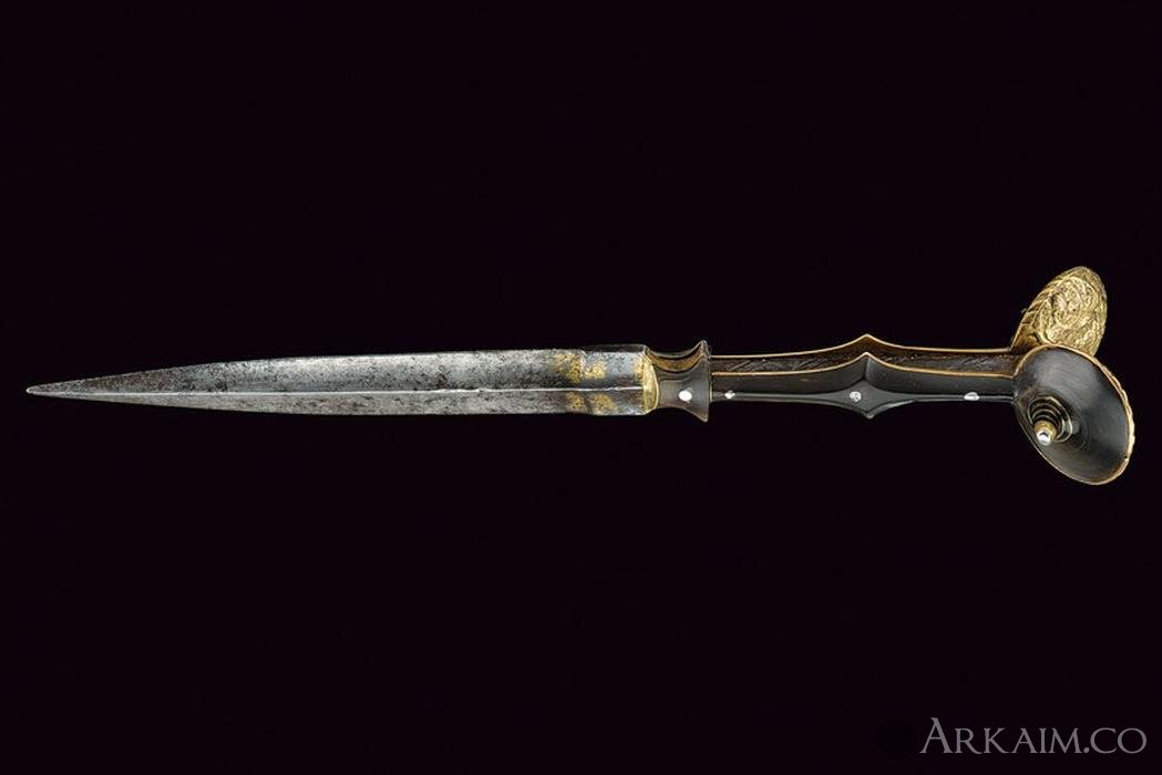 Появился ушастый кинжал в Европе, в Испании, в XIV веке и широко использовался до XVI века.