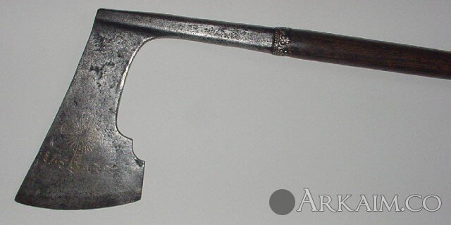 Это специализированный малый топор палача, предназначенный не для отрубания голов, я для усекновения иных частей тела — рук, например. Общая длина топора с топорищем 880 мм, длина рабочей части по обушной стороне 222 мм, длина рабочей части по спинке 237 мм, ширина 165 мм. На одной стороне топора изображение отрубленной руки в поле щита под короной и надпись под щитом, на староанглийском вписанная в два баннера: «GODES+HELPE+MEI+», на другой стороне изображение креста с надписью «INRI» и датой 1548 год.