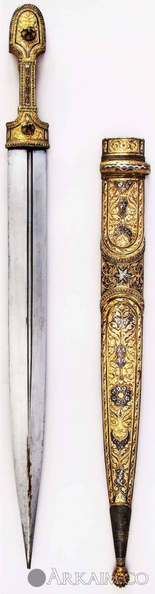 Кинжал кама начала XIX в. Сталь, золото, серебро, чернь. Длина с ножнами 53.3 см; длина без ножен 50.6 см; длина клинка 38.1 см; ширина клинка 3.3 см; вес 382.7 г; вес ножен 240.9 г. Метрополитен-музей, Нью-Йорк.