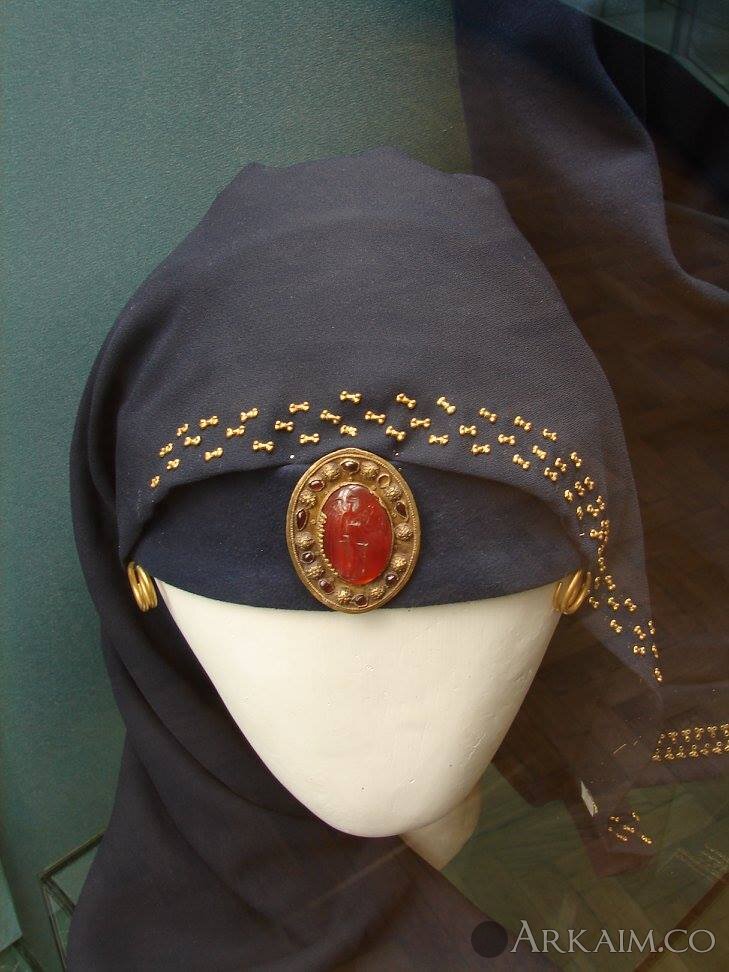 Фибула-брошь с изображением богини Ники на вставке. Золото, сердолик, альмандины, железо.