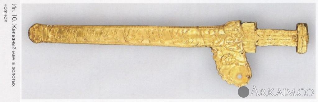 Рукоять железного меча и деревянные ножны украшены золотыми пластинами с рельефными изображениями.