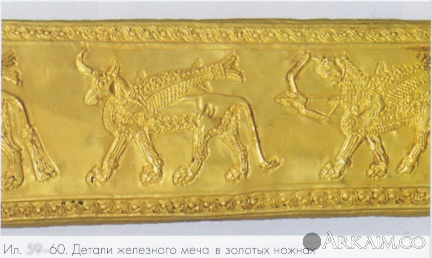 Рукоять железного меча и деревянные ножны украшены золотыми пластинами с рельефными изображениями.
