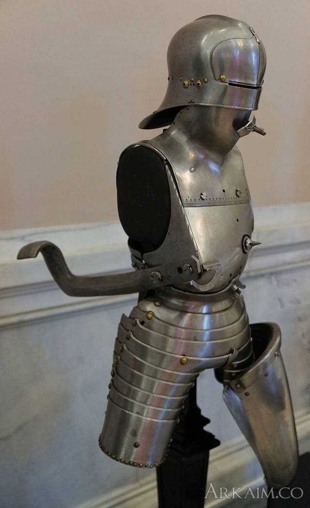 Чтобы облегчить удержание огромного турнирного копья в руках, турнирные доспехи снабжали специальными крюками – одним спереди, а другим – для упора – сзади. Последний помогал удерживать копье на линии удара и не позволял ему опускаться