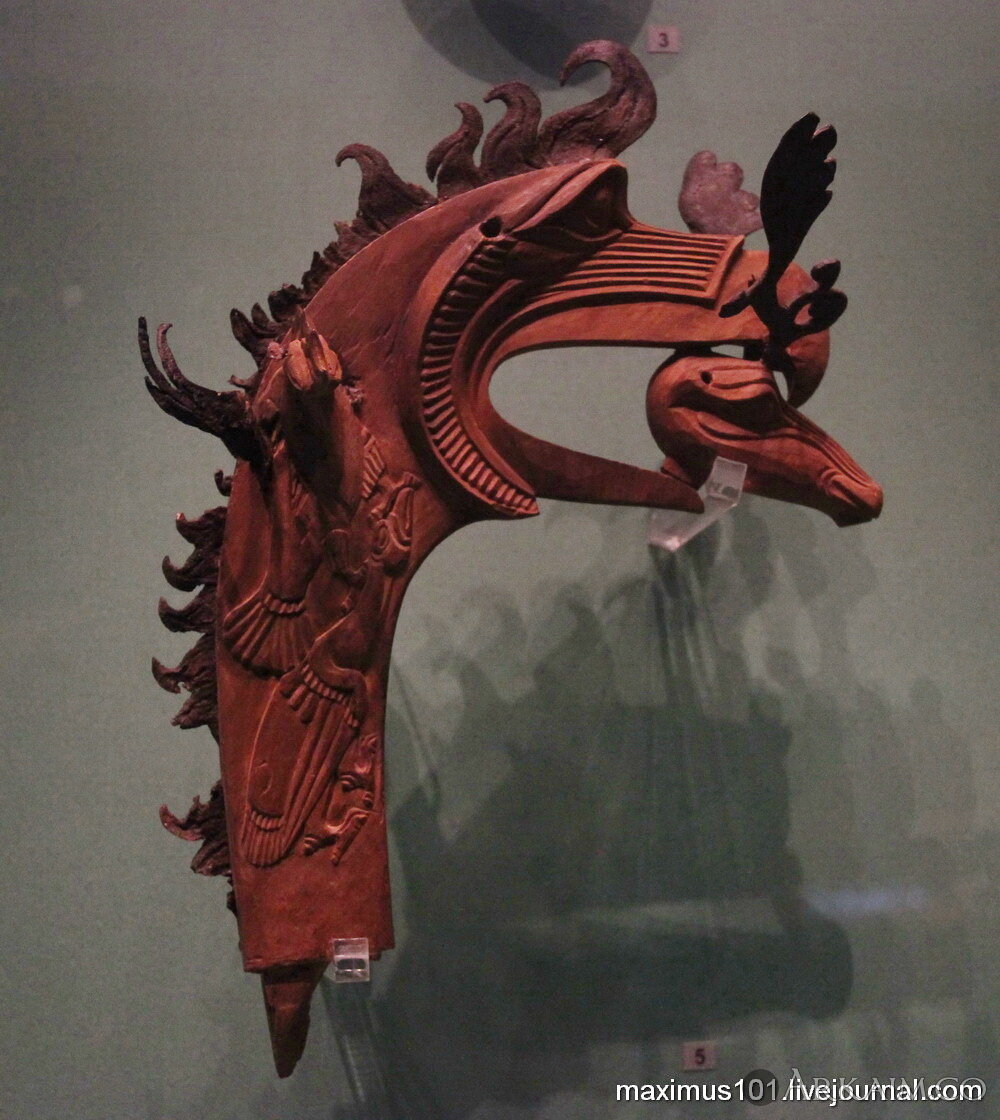 Деревянное навершие в виде головы грифона держащего во рту голову оленя. Могильник Пазырык, курган 2, V-IV вв. до н.э.