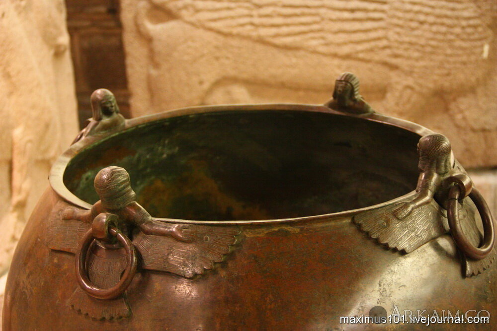 Бронзовые котлы из кургана "царя Мидаса" из Гордиона. Возможно котлы были урартского производства, несмотря на то, что нашли их во фригийском погребении. На заднем плане каменные фригийские рельефы из Анкары, у меня так и не появилось понимание, где конкретно их нашли. В Анкаре существовал крупный фригийский центр, хорошо известны фригийские курганы на территории столицы Турции, но вот откуда извлекли этих крылатых сфинксов и быков непонятно.