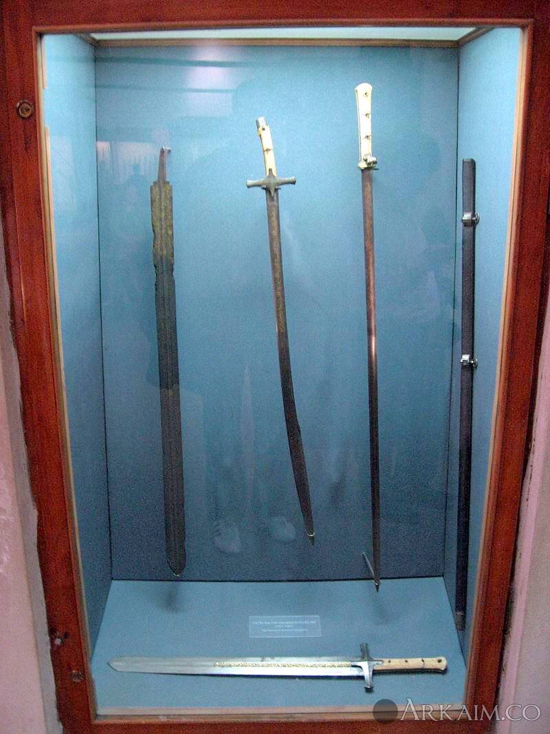 Меч (внизу), сабля (слева) и кончар (справа) султана Мехмеда Второго Завоевателя. Музей Топкапы, Стамбул