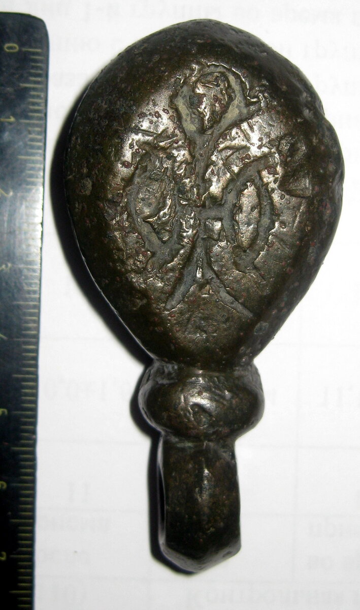 Кистень круглый, уплощенный в центре которого граффити в виде ангела? (сторона 2), тип 3А по Кирпичникову, 11-13 вв.