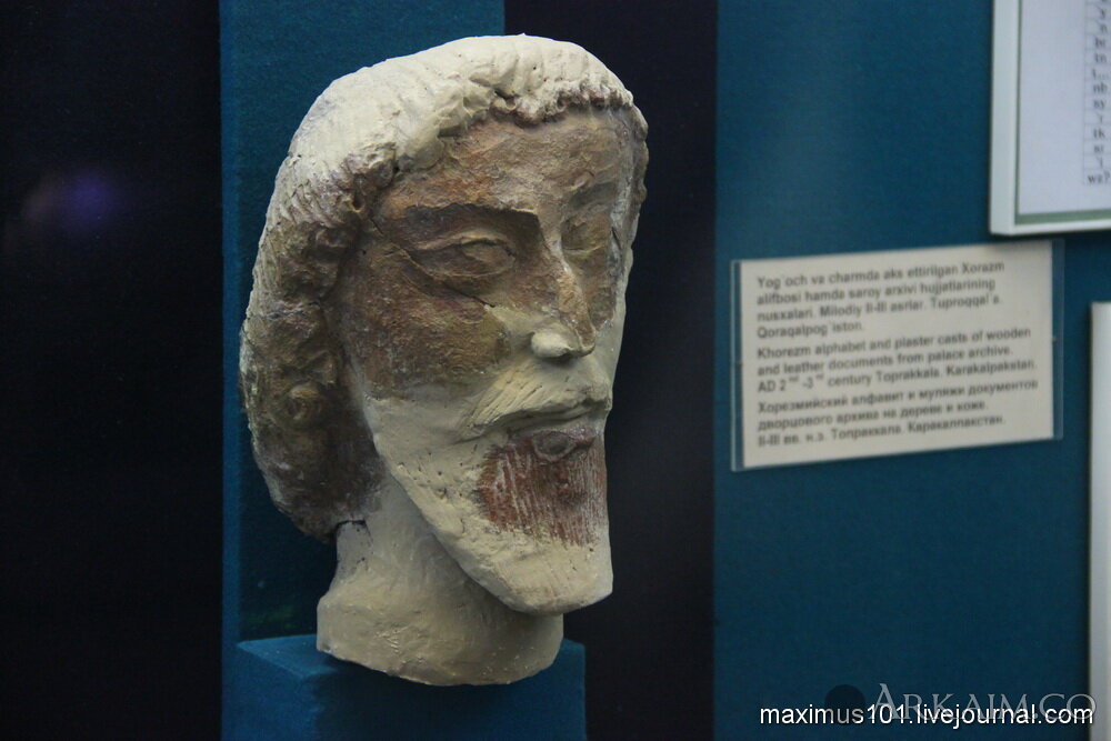 Фрагмент оссуария в виде головы мужчины, Бурлы-кала, на табличке стоит дата III-I вв. до н.э., но более правдоподобная дата скорее начало н.э.