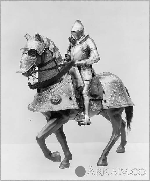 Рыцарь в доспехах и конь в конских латах. Работа мастера Кунца Лохнера. Нюрнберг, Германия 1510 – 1567 гг. Датируется 1548 г. Общий вес снаряжения всадника вместе с конскими доспехами и седлом 41.73 кг. Метрополитен-музей, Нью-Йорк