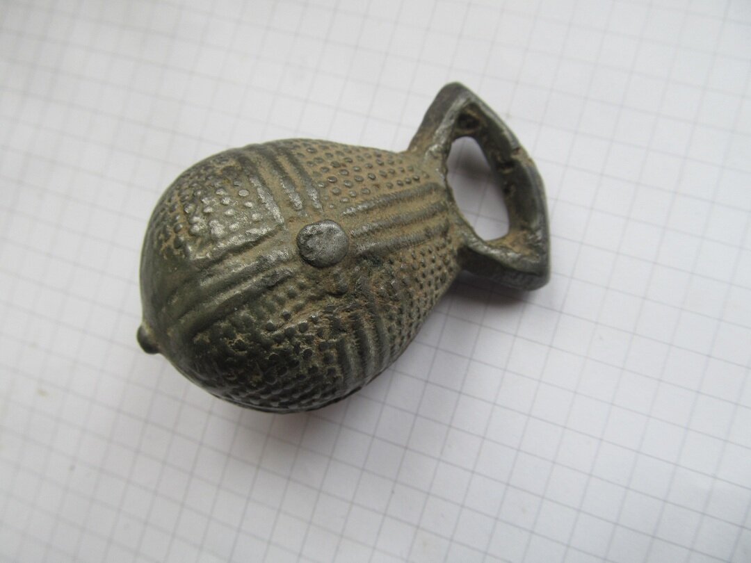 Кистень грушевидный орнаментированный мелкими горошковидными выпуклостями и валиками, которые формируют крест, тип 2 по Кирпичникову, вторая половина 10 - 13 вв. Хмельницкая обл.