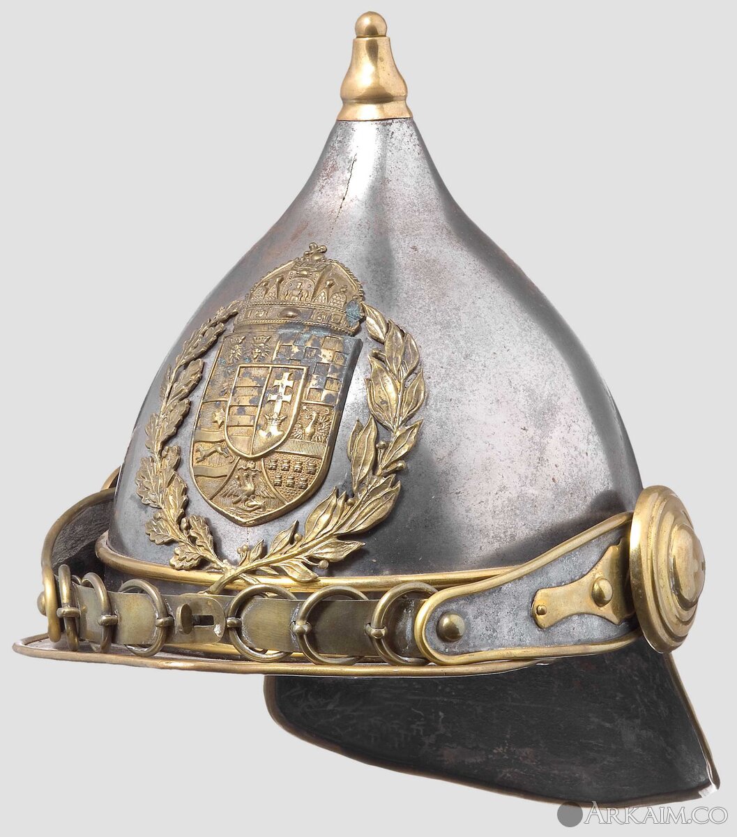 Шлем королевской "гвардии" Венгрии - это подразделение называлось Королевская Стража Короны Венгерского королевства - церемониальная часть, призванная охранять государственные регалии. Потом она называлась Парламентская Стража (потому что охраняла Парламент с хранящимися там государственными символами). Сейчас это Стража Венгерской Короны.