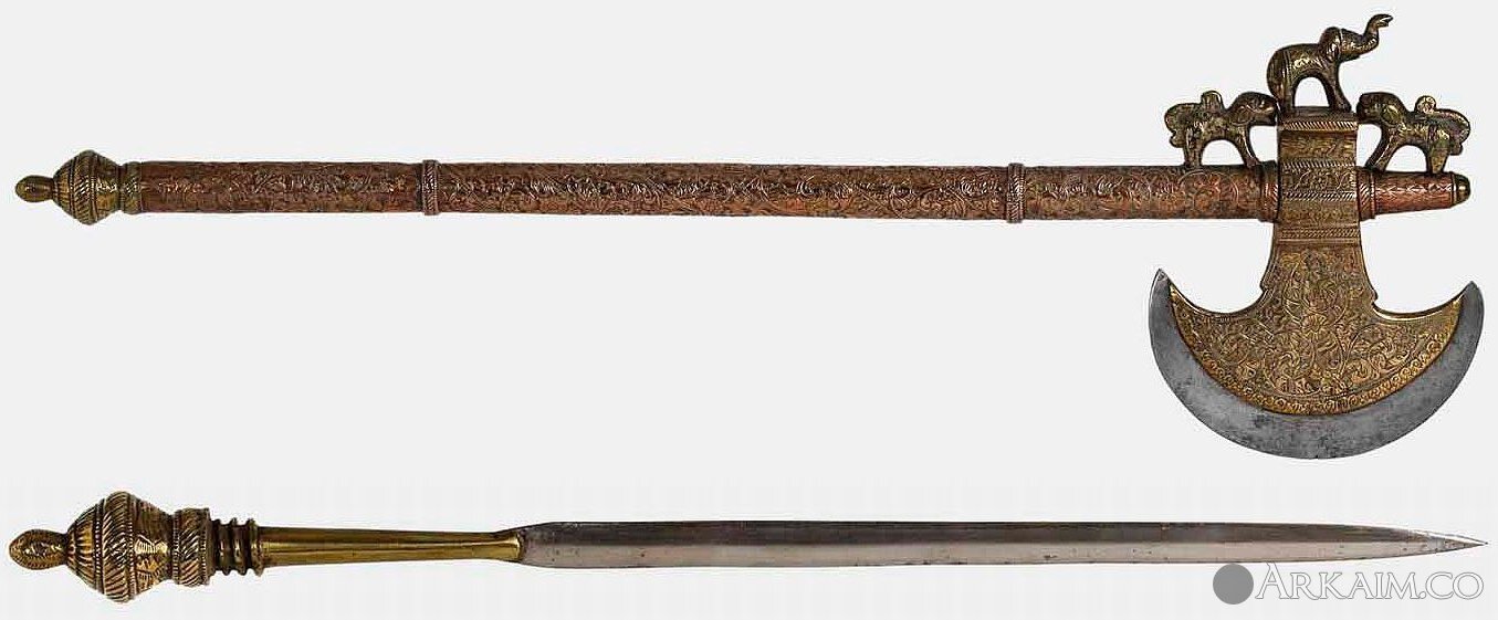 Табар 19-го века из Северной Индии. Украшен гравировкой, латунью и позолотой. В рукоять табара, как в ножны, встроен кинжал.