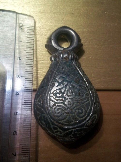 Кистень грушевидный уплощенный с черневым орнаментом, тип 3 по Кирпичникову, вторая половина 12 - 13 вв.