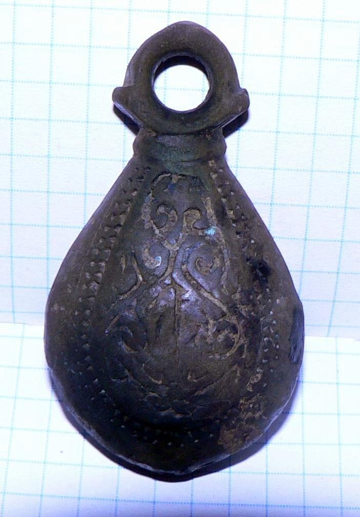 Кистень грушевидный уплощенный с черневым орнаментом, тип 3 по Кирпичникову, вторая половина 12 - 13 вв. Сумская обл.