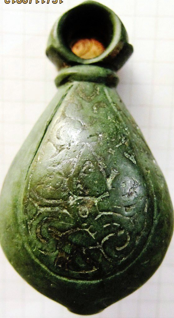 Кистень грушевидный уплощенный с черневым орнаментом, тип 3 по Кирпичникову, вторая половина 12 - 13 вв.