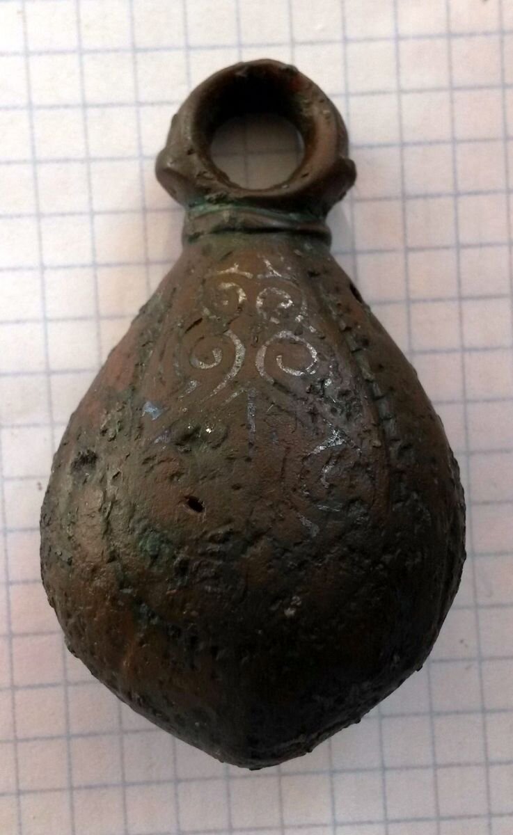 Кистень грушевидный уплощенный с черневым орнаментом, тип 3 по Кирпичникову, 81,6 гр., вторая половина 12 - 13 вв.