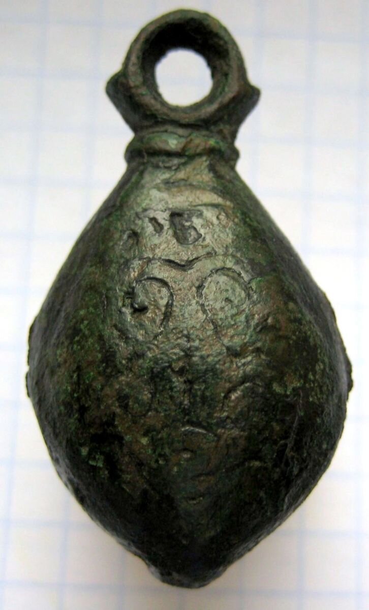 Кистень грушевидный уплощенный с черневым орнаментом, тип 3 по Кирпичникову, вторая половина 12 - 13 вв. Сумская обл.
