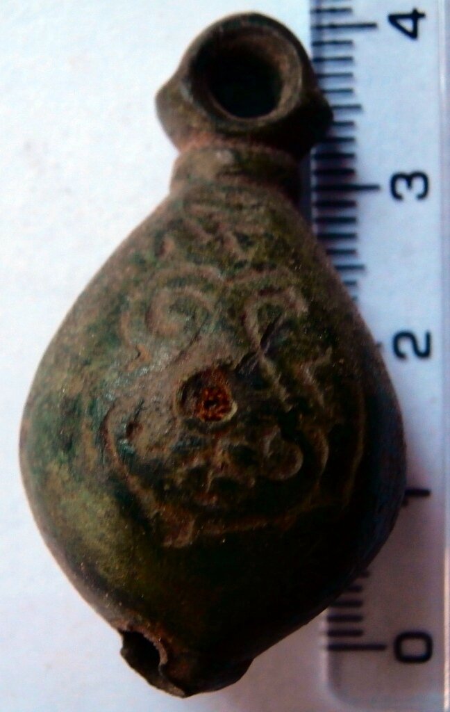 Кистень грушевидный уплощенный с черневым орнаментом, тип 3 по Кирпичникову, вторая половина 12 - 13 вв. Черниговская обл.