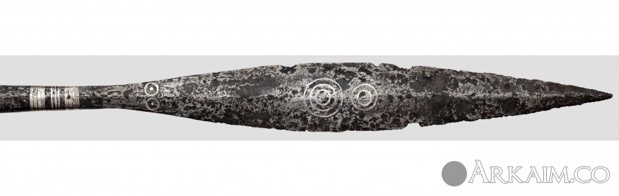 Копье с листовидным наконечником 8-9 веков. Наконечник тонкий, в поперечнике ромбовидный с инкрустацией серебром в виде концентрических кругов с обеих сторон и в основании лопасти. Общая длина копья 2230 мм, длина наконечника 414 мм