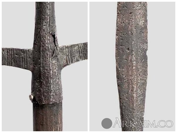 Крылатое копье 9-10-го веков, работы франкских оружейников. Общая длина 2340 мм, длина наконечника 500 мм. Наконечник листовидной формы, в поперечном сечении ромбический