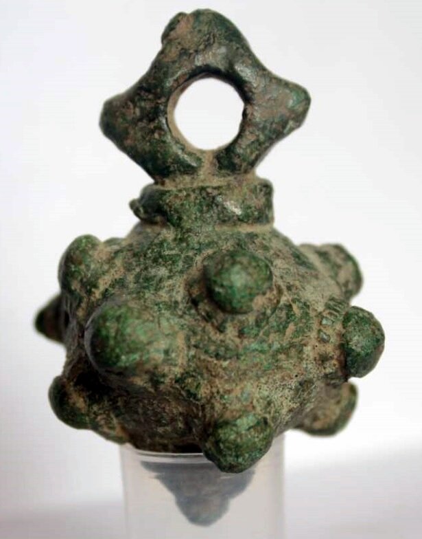 Кистень шаровидный имитирующий булаву выпуклостями 59,7х45,1 мм, вес 147 гр., тип 5 по Кирпичникову, 12-13 вв. Пермский край, Соликамский район