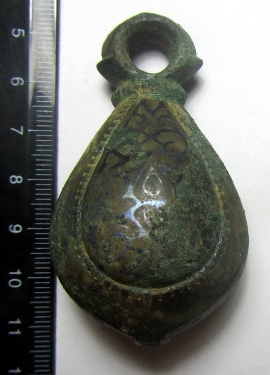 Кистень грушевидный уплощенный с черневым орнаментом, тип 3 по Кирпичникову, вторая половина 12 - 13 вв.