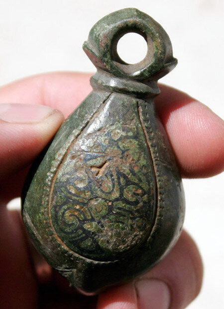 Кистень грушевидный уплощенный с черневым орнаментом, тип 3 по Кирпичникову, вторая половина 12 - 13 вв.