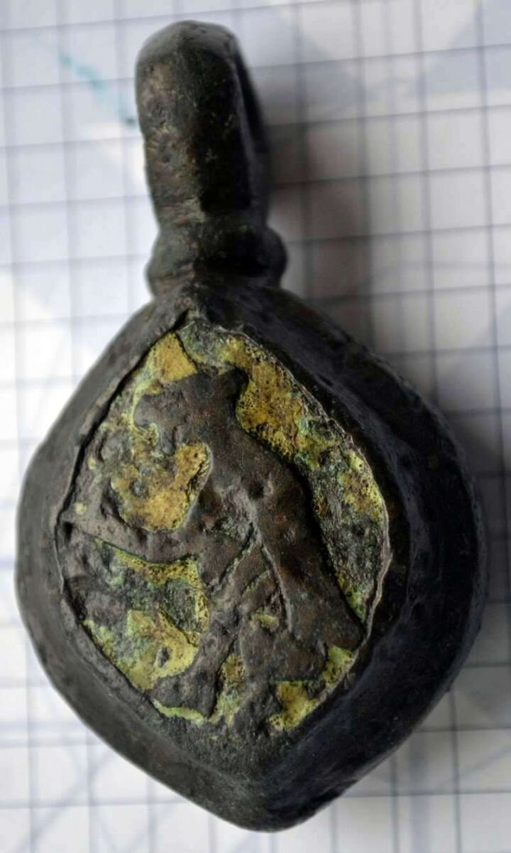 Кистень круглый уплощенный с изображением птицы с одной стороны и воина? с другой, тип 3А по Кирпичникову, 12-13 вв. (фото 2)