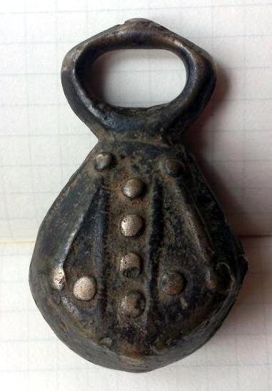 Кистень круглый уплощенный орнаментированный горошинами и валиками, тип 3А по Кирпичникову, 12-13 вв.