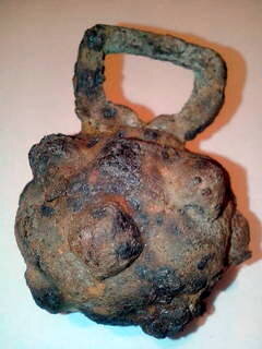 Кистень в виде куба со срезанными углами и напаянными шипами, железо, 500 гр., 4 тип по Кирпичникову, 12 - пп. 13 вв. Киевская обл.