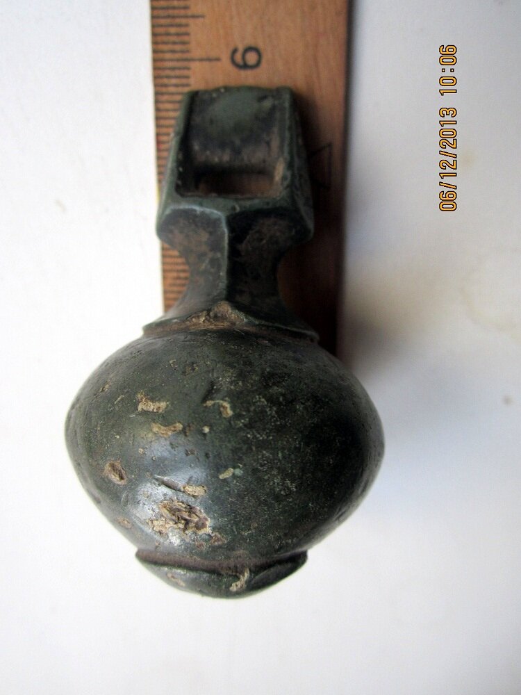 Кистень шаровидный гладкий с узорным перехватом в виде лепестков и квадратным ушком, тип 4 вариант 2 по Колчевому, вторая половина 8 - начало 10 вв.