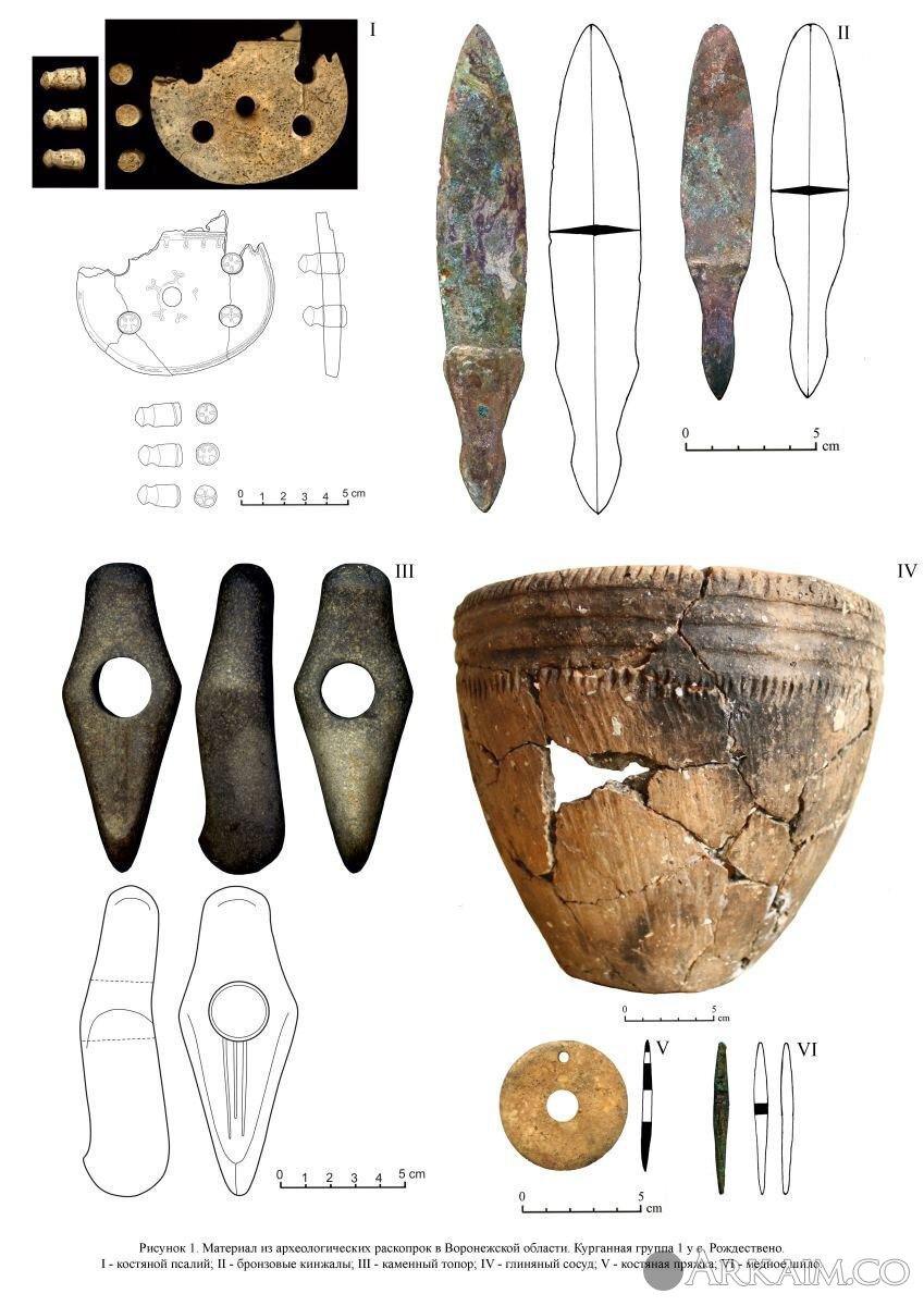 Комплекс захоронения абашевской культуры (2140—1740 гг до н.э.). Каменный сверленый топор, бронзовые кинжалы, костяной псалий. Село Рождествено Лискинского района Воронежской области (левобережье Среднего Дона)