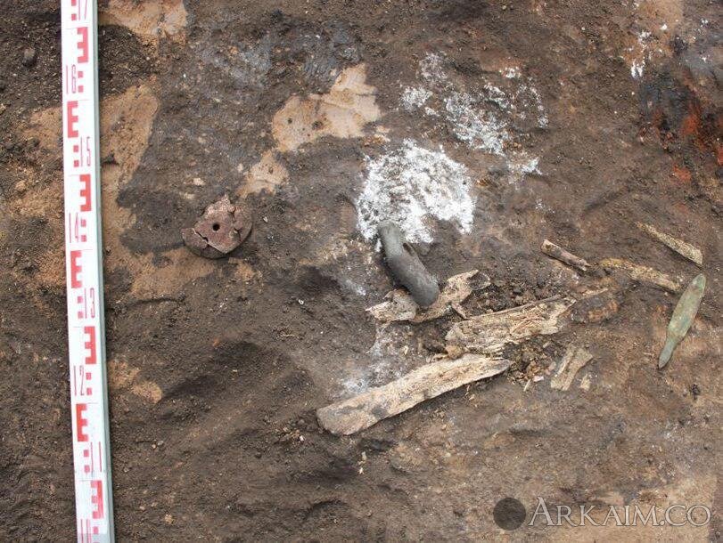 Комплекс захоронения абашевской культуры (2140—1740 гг до н.э.). Каменный сверленый топор, бронзовые кинжалы, костяной псалий. Село Рождествено Лискинского района Воронежской области (левобережье Среднего Дона)