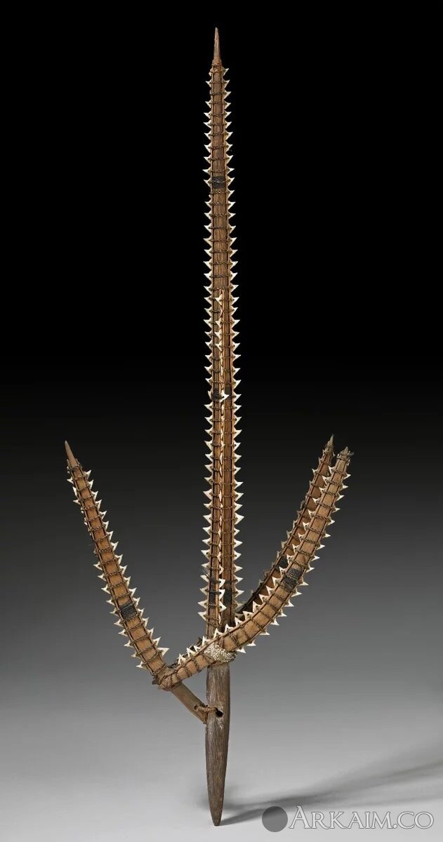 Трехгранный меч из кокосового дерева, с акулами зубами равномерно прикрепленными по всей длине, изготовленный на Кирибати (острова Гилберта) в Микронезии
