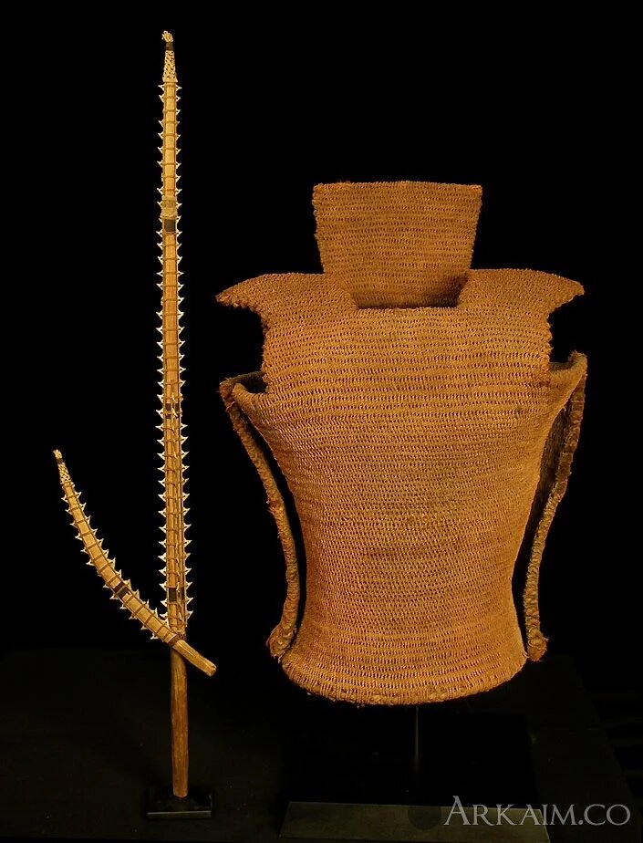 Меч из кокосового дерева, с акулами зубами равномерно прикрепленными по всей длине и доспех из кокосовых волокон, изготовленные на Кирибати (острова Гилберта) в Микронезии.