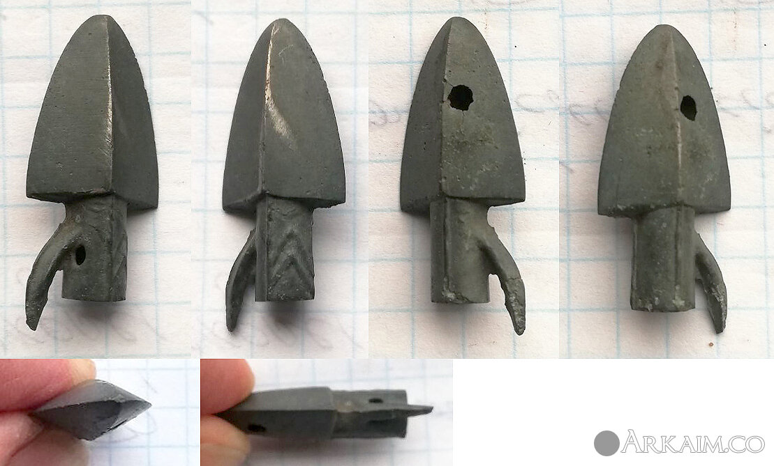 Наконечник сакского типа с удлиненной выделенной втулкой и шипом, головка треугольной формы с прямыми плечиками, ромбовидная в сечении; на втулке расположена тамга. 7-6 вв до.н.э.