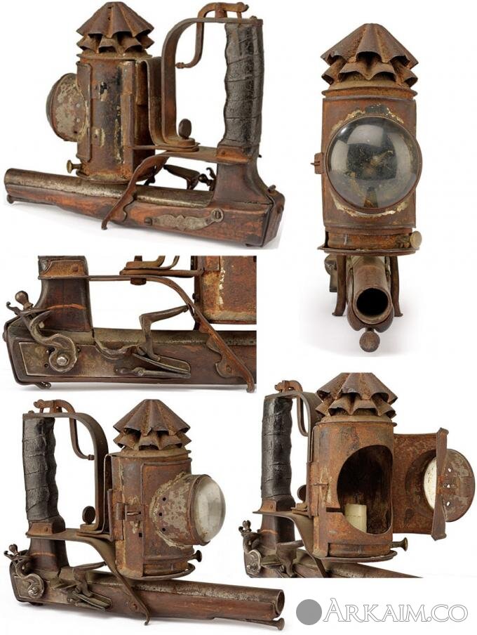 Кремневый пистолет с устройством для подсветки цели изготовлен в Северной Италии в начале XIX века. Над стволом весьма солидного калибра 17 миллиметров укреплен свечной фонарь с линзой, концентрирующей луч света на цели наподобие марки лазерного прицела. Свеча закрывается сдвижной крышкой, которую можно открыть неожиданно, чтобы временно ослепить и дезориентировать противника. Полка и огниво сверху прикрыты пластиной, благодаря чему пистолет можно использовать в дождь и снегопад.