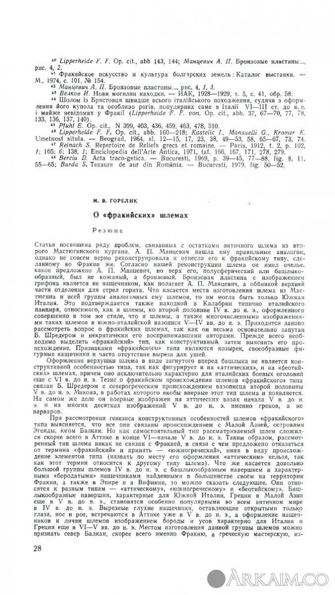 Горелiк М.В. Про ''фракiйськi'' шоломы. ж.Археологiя. № 44, 1983, Ки?в. С.14-29