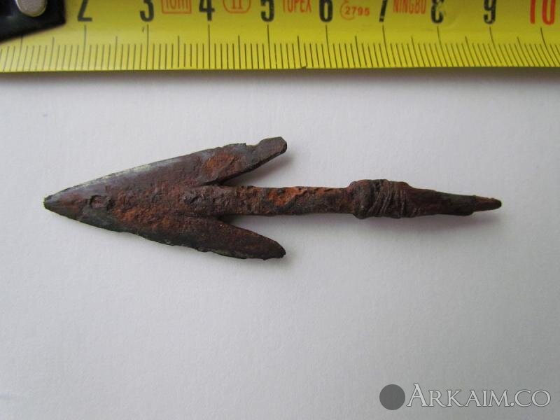Двушипный без упора, узкий, большой с остатками древка и обмотки, тип 29 по Медведеву, 8-пп. 14 вв.