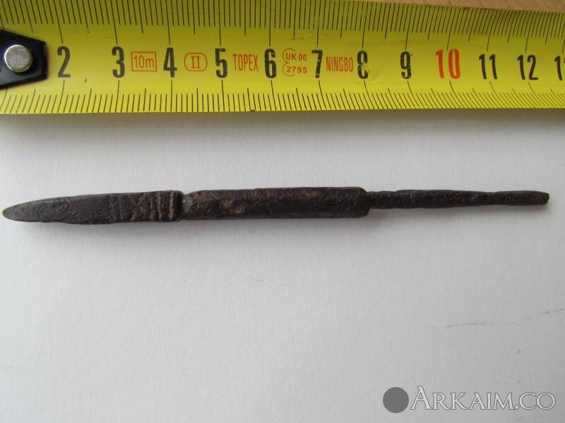 Пулевидный квадратного сечения с длинной цилиндрической шейкой и коротким черешком, орнаментирован графическим орнаментом, предположительно 10-11 вв.