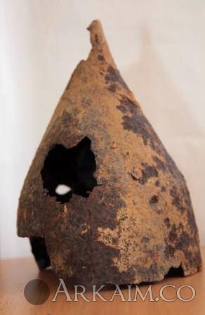 Еще одной деталью, отличающей калкинскую находку от поросских, является иная разновидность шлема. Так, если маски из Ковалей и Липовца крепились к шлемам с "пирамидальной" верхней частью, то калкинская маска крепилась к цилиндр о коническому шлем.