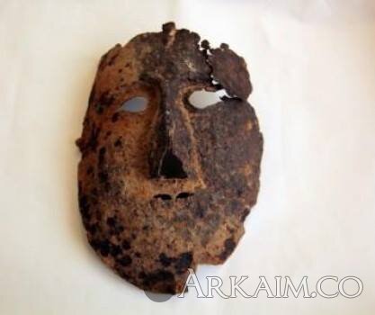 Маска овальной формы (рис.2, I), ее размеры 18x24 см. Изготовлена из листа железа толщиной 2-2,5 мм. Она имеет четко проработанные черты верхней части лица: слегка раскосые миндалевидные прорези глаз с оглазиями, составляющий прямую линию со лбом сильно выступающий нос, в нижней части которого имеются два подтрапециевидных отверстия для дыхания.
