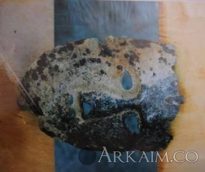 С другой стороны, нижняя часть лица проработана очень схематично. Так, практически отсутствует подбородочный выступ, абсолютно не оформлен рот, представляющий собой два узких отверстия, разделенных перемычкой. Тем не менее, есть данные, свидетельствующие, что маска из калкинского комплекса имела утраченные в древности детали. Так, в районе ушей есть два штифта-заклепки. Еще один штифт находится в подбородочной части предмета. Возможно, при помощи их к маске крепились утраченные в древности "уши" и художественно оформленная "нижняя часть лица" из другого металла или какого-либо материала. Так или иначе, воин, носивший эту маску, мог дышать как ртом, так и носом. В верхней части маски, в центре лба имеется массивная подтреугольная пластина с направленным внутрь штифтом. При его помощи предмет крепился к шлему. Правая сторона лба маски имеет современное повреждение, образовавшееся, когда маску снимали со шлема. Согласно сообщению ребят, в момент находки маска была прикреплена к шлему в боевом положении. Об этом свидетельствует стесанность ржавчины на штифте маски и отверстии в центре шлема, а также то, что сейчас, в связи с современным повреждением, присоединить маску к шлему невозможно. В пользу этого говорит и фотография, сделанная сразу же после находки, на которой шлем и маска лежат на склоне яра в собранном виде.