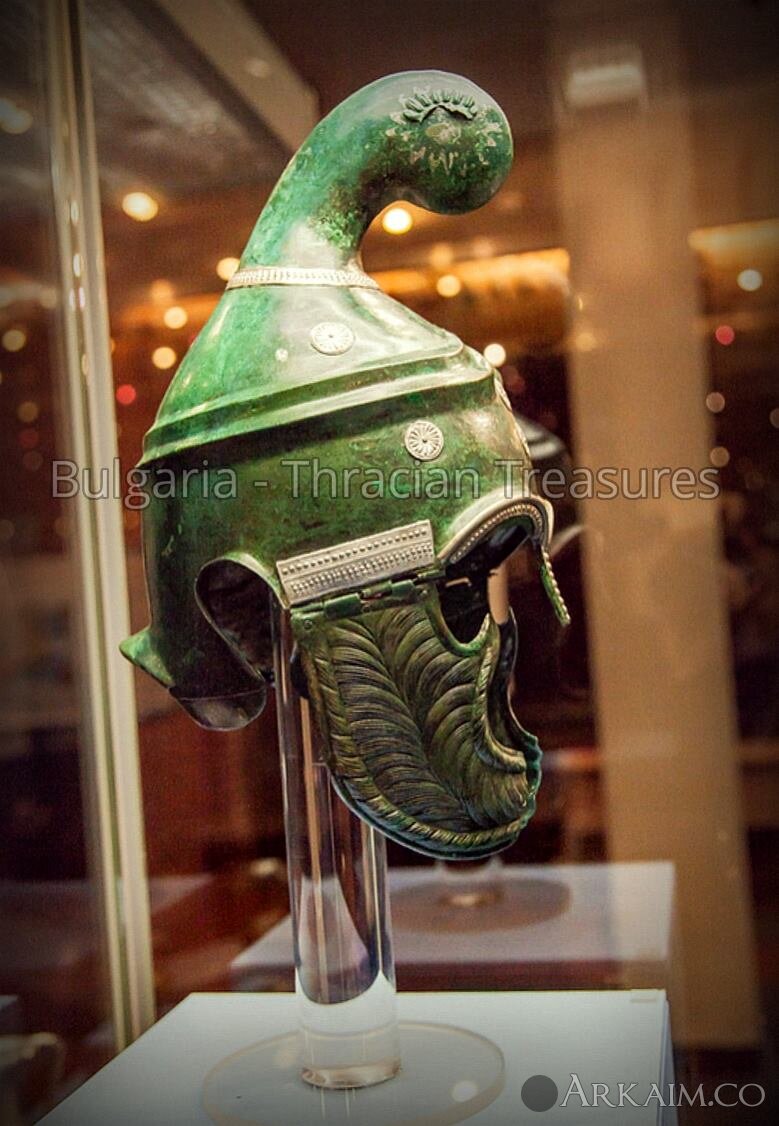 Фракийский тип шлема с уникальными украшениями из бронзы и серебра. Датировано серединой IV века до н. э. Из деревни Плетена, Западный Родоп.