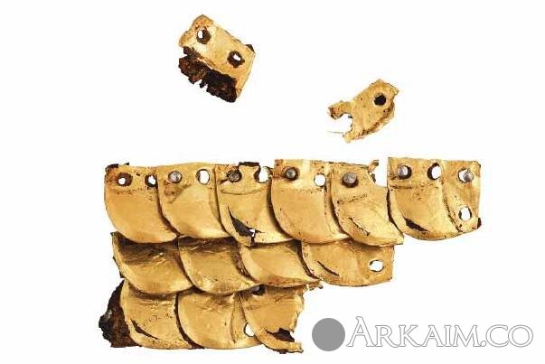 Броня из фракийской чешуи (фрагмент). Золото, железо.Фрагмент: 5,4 × 2,7 см. 4 в. до н.э. Найден в Староселе, Пловдивская обл. Национальный исторический музей - София.