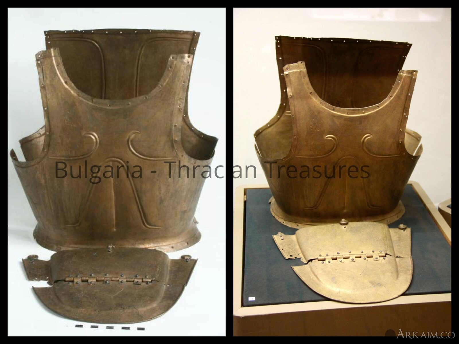 Бронзовые фракийские доспехи состоят из двух скрепленных по бокам частей. Нижняя часть торса вывернута наружу. Грудь отмечена двумя кривыми. Линия спины обозначена вогнутостью в нижней половине гипса. Село Руец, Тырговиште область, Болгария. 5 век до н.э.