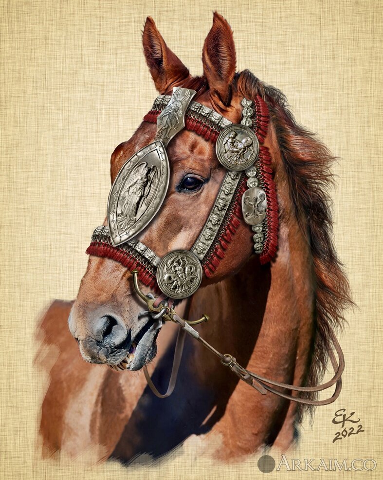 Цитата : "...подбородный ремень был сплошь обшит мелкими серебряными бляшками с изображением головы Горгоны, дополнявшимися спаренными бусинами-колечками. Все ремни узды сплошь были обшиты серебряными бляшками с изображением головы Горгоны, молодого Геракла и маски льва. Бляшки вплотную примыкали друг к другу и крупным бляхам. Дополнительно к этому ремни вдоль одного края были расшиты мелкими серебряными бусинами -колечками, соединёнными окислами по две вместе. Несомненно, что и на ремни они нашивались попарно. Целыми их обнаружено 426, но ещё большее количество превратилось в мелкие обломки и тлен, распавшийся при первом прикосновении..." Мозолевский Б.Н.